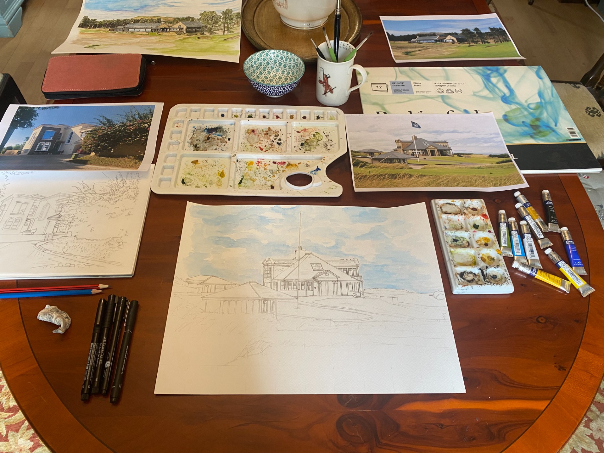 I work from photographs, initially in pencil, before using watercolour and if so desired finishing in pen and ink.